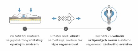 Tato technologie připomíná rehabilitační trakci, kterou znají pacienti z ordinací fyzioterapeutů, ovšem zde ji dostáváte každou noc přímo doma. Matrace tak díky tomuto patentovanému systému, který jemně protahuje a uvolňuje meziobratlové ploténky, aktivně regeneruje a rehabilituje vaši páteř a zádové svalstvo během spánku.